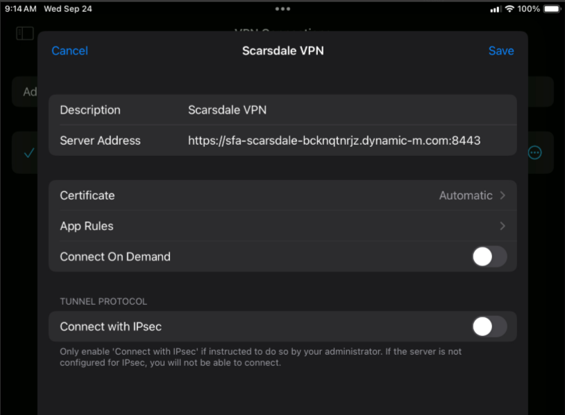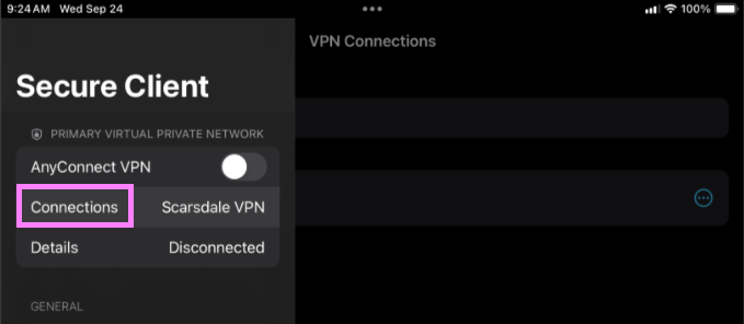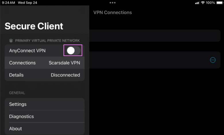 To connect to the VPN, go back to the main page and make sure the Scarsdale VPN is selected, then tap the toggle next to AnyConnect VPN.